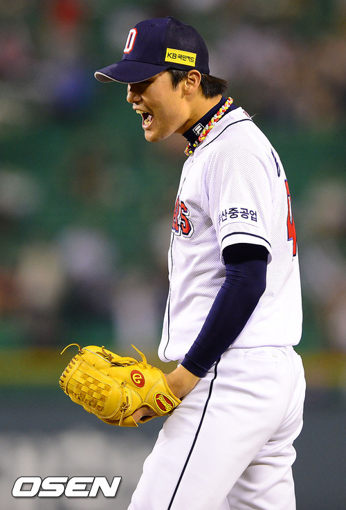 27일 오후 서울 잠실구장에서 열린 2012 팔도 프로야구 두산 베어스와 롯데 자이언츠의 경기 9회초 2사 1,2루 롯데 박종윤의 내야땅볼때 두산 홍상삼 투수가 커버플레이로 아웃 시킨후 미소 짓고 있다
