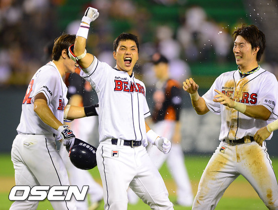 9회말 2사 1,2루 두산 이종욱이 끝내기 안타를 날리고 환호하고 있다 /soul1014@osen.co.kr