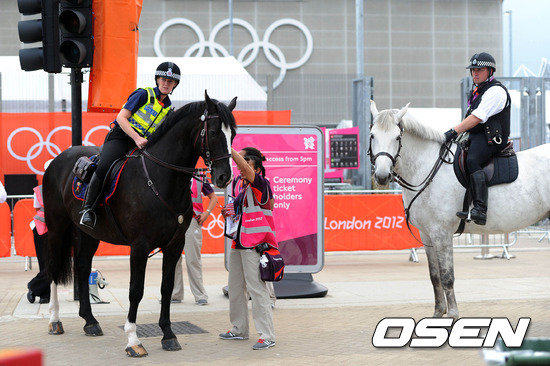[OSEN=런던(영국), 올림픽공동취재단] 2012 런던올림픽 개막식이 28일 오전 (한국시간) 올림픽 메인 스타디움에서 열린 가운데 말을 탄 경찰들이 경기장 주변을 살피고 있다.