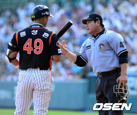 28일 오후 서울 잠실구장에서 열린 '2012 팔도 프로야구' 두산베어스와 롯데 자이언츠의 경기 1회초 2사 1루 홍성흔이 포수 수비방해 아웃을 당하고 있다.