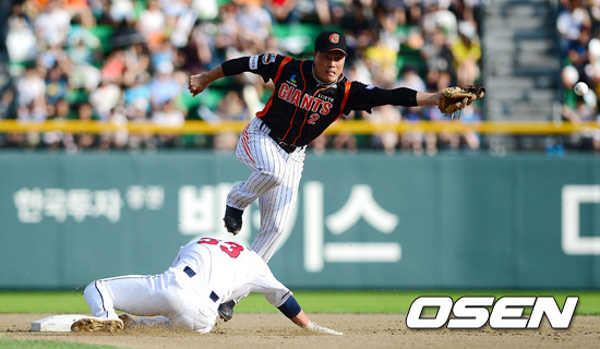 28일 오후 서울 잠실구장에서 열린 '2012 팔도 프로야구' 두산베어스와 롯데 자이언츠의 경기 1회말 2사 1루 김동주의 타석, 오재원이 도루에 성공하고 있다. 오재원은 이날 5년연속 두자릿수 도루에 성공했다. 역대 48번째.