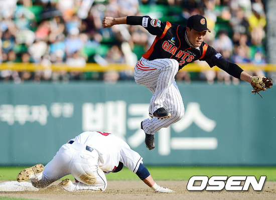 28일 오후 서울 잠실구장에서 열린 '2012 팔도 프로야구' 두산베어스와 롯데 자이언츠의 경기 1회말 2사 1루 김동주의 타석, 오재원이 도루에 성공하고 있다. 오재원은 이날 5년연속 두자릿수 도루에 성공했다. 역대 48번째.