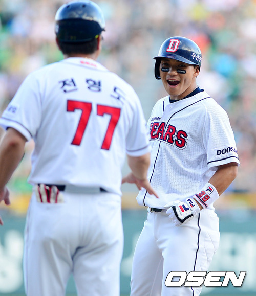 28일 오후 서울 잠실구장에서 열린 '2012 팔도 프로야구' 두산베어스와 롯데 자이언츠의 경기 2회말 무사 1,3루 이종욱이 1타점 적시타를 치고 1루에서 환호하고 있다.
