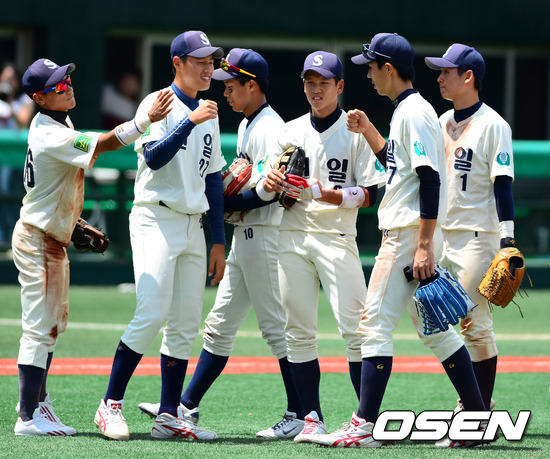 경기 종료 후 신일고 선수들이 기뻐하고 있다.