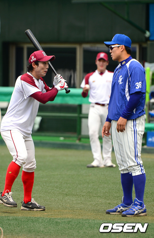 29일 서울 목동구장에서 열린 '2012 팔도 프로야구' 넥센 히어로즈와 삼성 라이온즈의 경기전 넥센 정수성과 삼성 이승엽이 타격자세에 대해 이야기를 하고 있다.