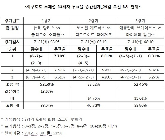 [야구토토] 국민체육진흥공단(www.kspo.or.kr)이 발행하는 체육진흥투표권 수탁사업자인 스포츠토토 공식 온라인 발매 사이트인 베트맨(www.betman.co.kr)이 오는 31일 열리는 미국프로야구(MLB) 3경기를 대상으로 한 야구토토 스페셜 33회차 투표율을 중간집계 한 결과, 국내 야구팬의 52.69%는 뉴욕 양키스-볼티모어 오리올스(1경기)전에서 홈팀 뉴욕 양키스의 승리를 내다봤다고 밝혔다.
