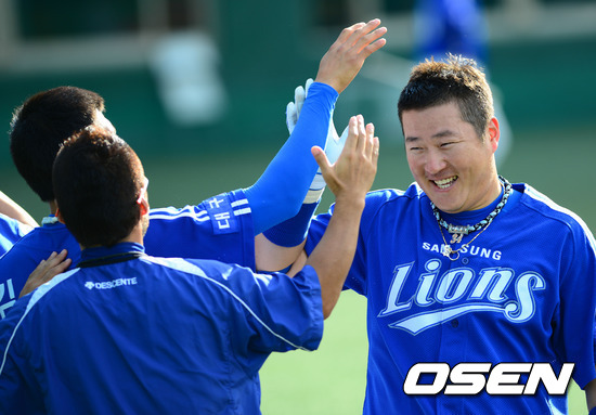 29일 서울 목동구장에서 열린 '2012 팔도 프로야구' 넥센 히어로즈와 삼성 라이온즈의 경기, 2회초 1사 삼성 최형우가 솔로 홈런을 치고 더그아웃에서 선수들에게 축하를 받고 있다.