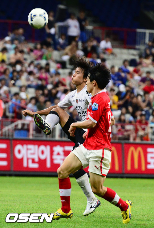 29일 오후 부산 아시아드 주경기장에서 열린 '현대오일뱅크 K리그 2012' 24라운드 부산 아이파크-포항 스틸러스 경기 후반, 포항 김광석과 부산 한지호가 공중볼 다툼을 하고 있다.
