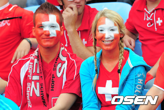 [OSEN=코벤트리(영국), 올림픽공동취재단] 30일(이하 한국시간) 오전 1시 15분 코벤트리의 시티 오브 코벤트리 스타디움서 열린 '2012 런던 올림픽 남자 축구 조별리그' B조 2차전 한국과 스위스의 경기 시작 전 스위스 팬들이 응원을 펼치고 있다.