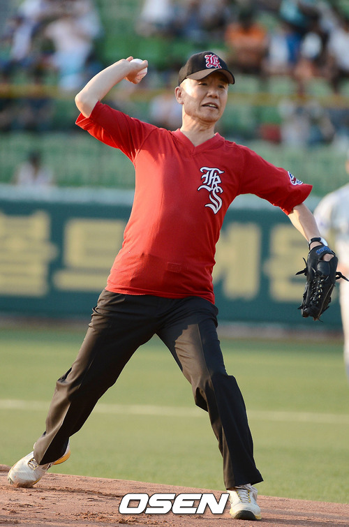 31일 대구구장에서 열린 '2012 팔도 프로야구' 삼성 라이온즈와 두산 베어스 경기에 앞서 김영도 경상중학교 교장이 승리기원 시구를 하고 있다.