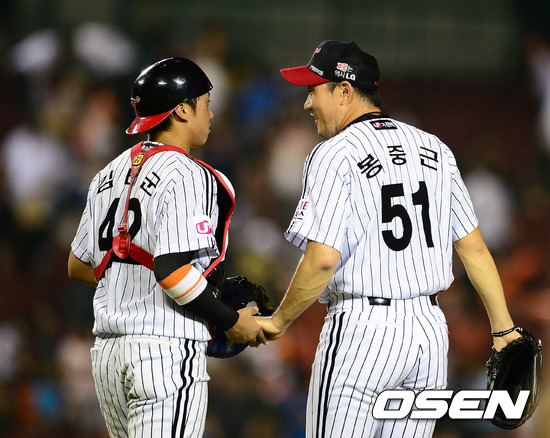 경기 종료 후 LG 김태군과 봉중근이 승리의 기쁨을 나누고 있다. / sunday@osen.co.kr