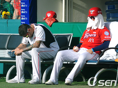 무더위로 악명이 높은 대구구장의 원정팀 덕아웃은 찜통 그 자체. 오후에 해가 비치는 1루라 벤치에 앉아 있는게 힘들다.