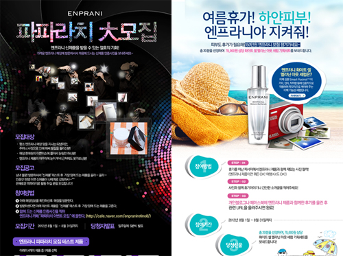 파파라치 이벤트는 4가지의 엔프라니 신상품을 매장에서 테스트 한 후 가장 마음에 드는 제품의 사진을 찍어 엔프라니 페이스북에 올리면 응모가 완료된다. 일주일에 5명씩 선정해 발표되며, 8월 한 달 동안 5주에 걸쳐 진행될 예정이다. 리뉴얼 후 첫 출시 제품인 ‘유스셀 엑티베이터’를 포함해 메이크업을 도와줄 비비크림과 프라이머, 화이트닝 관리를 위한 세럼까지 취향에 맞게 고를 수 있도록 이벤트 제품을 구성했다.
