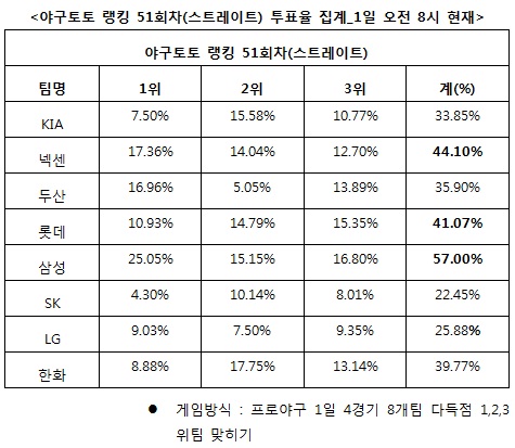 국민체육진흥공단(www.kspo.or.kr)이 발행하는 체육진흥투표권 수탁사업자인 스포츠토토 공식 온라인 발매 사이트인 베트맨(www.betman.co.kr)이 오는 8월 2일(목) 오후 6시 30분에 열리는 2012 프로야구 4경기 8개팀을 대상으로 한 야구토토 랭킹 51회차 스트레이트 게임을 중간집계한 결과, 참가자들은 삼성(57.00%), 넥센(44.10%), 롯데(41.07%) 순으로 다득점 상위 3개팀을 꼽았다. 반면 LG(25.88%)와 SK(22.45%)는 가장 적은 득점을 기록할 것으로 예상됐다.