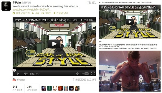 티 페인은 지난 달 29일 자신의 트위터에 "말로 설명할 수 없을 정도로 대단한 뮤직비디오"라며 싸이의 곡 '강남스타일' 뮤직비디오를 게재했다.