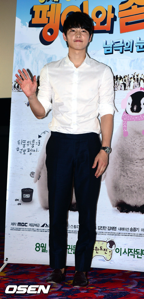 1일 오후 동대문 메가박스에서 진행된 MBC 다큐멘터리 '남극의 눈물' 영화판 '황제펭귄 펭이와 솜이' 언론배급 시사회에서 송중기가 포토타임을 갖고 있다.