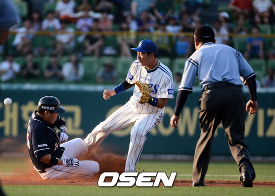 1일 대구구장에서 열린 '2012 팔도 프로야구' 삼성 라이온즈와 두산 베어스 경기 2회초 1사 2루 이원석 좌측 펜스근처 플라이아웃때 2루 주자 양의지 2루에 황급히 귀루하고 있다.