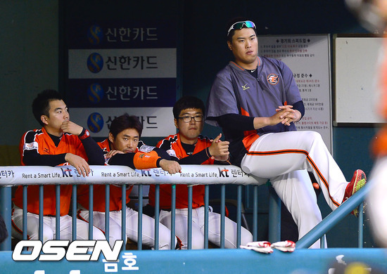 1일 오후 서울 잠실구장에서 열린 2012 팔도 프로야구 LG 트윈스와 한화 이글스의 경기 한화 류현진이 경기를 지켜보고 있다.