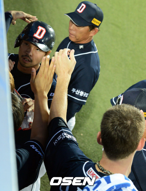 1일 대구구장에서 열린 '2012 팔도 프로야구' 삼성 라이온즈와 두산 베어스 경기 4회초 1사 3루 김현수 좌익수 희생플라이때 3루 주자 오재원 태그업 득점을 올리며 덕아웃 동료의 축하를 받고 있다.