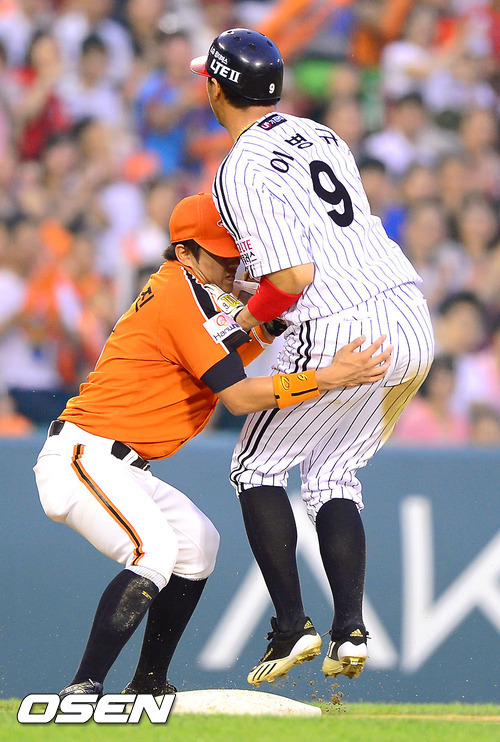 1일 오후 서울 잠실구장에서 열린 2012 팔도 프로야구 LG 트윈스와 한화 이글스의 경기 4회말 무사 2루 LG 정성훈의 내야땅볼때 2루 주자 이병규가 한화 오선진 3루수에게 태그아웃되고 있다