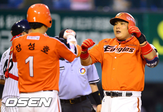 1일 오후 서울 잠실구장에서 열린 2012 팔도 프로야구 LG 트윈스와 한화 이글스의 경기 5회초 2사 1루 한화 김태균이 2점 홈런을 날리고 장성호와 하이파이브를 하고 있다