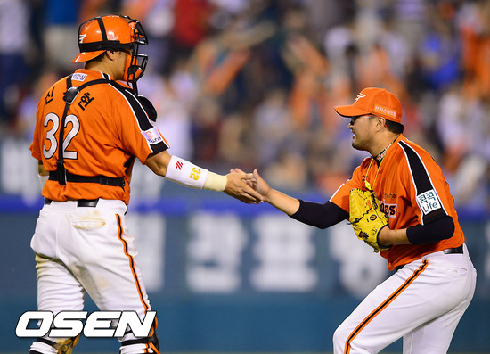 경기종료후 한화 안승민 마무리 투수와 신경현이 승리의 기쁨을 나누고 있다 / soul1014@osen.co.kr