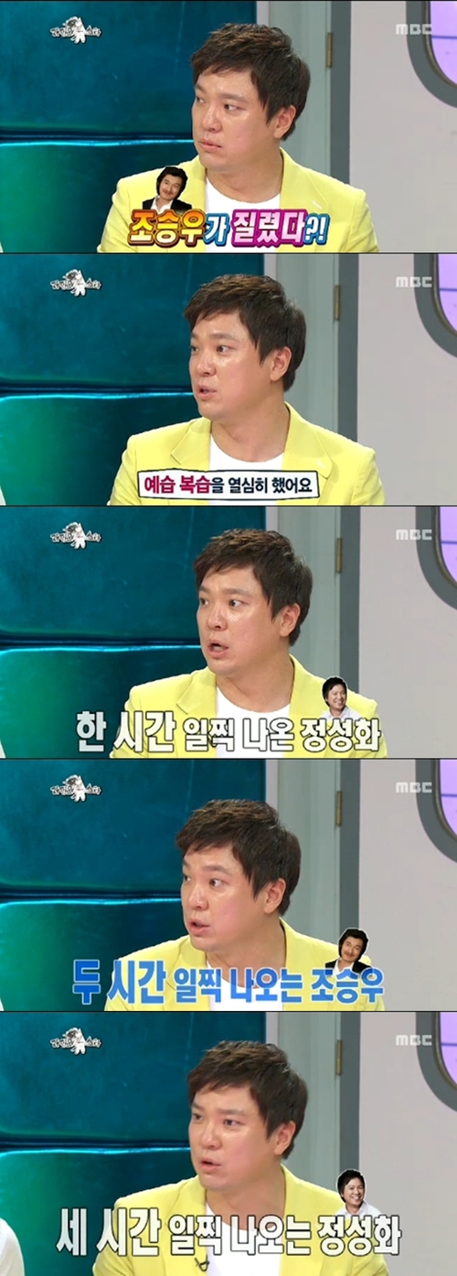정성화는 1일 오후 방송된 MBC '황금어장-라디오스타'에 출연해 조승우와 뮤지컬 '맨 오브 라만차'에 출연했을 당시의 에피소드를 전했다.