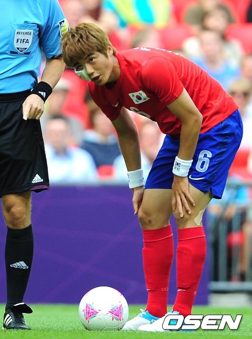[OSEN=런던(영국), 올림픽공동취재단] 2일(한국시간) 새벽 영국 런던 웸블리 스타디움에서 벌어진 2012런던올림픽 남자축구 조별리그 B조 최종전 가봉과의 경기 전반 기성용이 얼굴에 붕대를 하고 경기를 하고 있다.