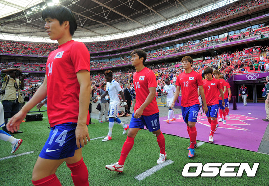 [OSEN=런던(영국), 올림픽공동취재단] 2일(한국시간) 새벽 영국 런던 웸블리 스타디움에서 벌어진 2012런던올림픽 남자축구 조별리그 B조 최종전 가봉과의 경기에 앞서 대한민국 선수들이 입장하고 있다.
