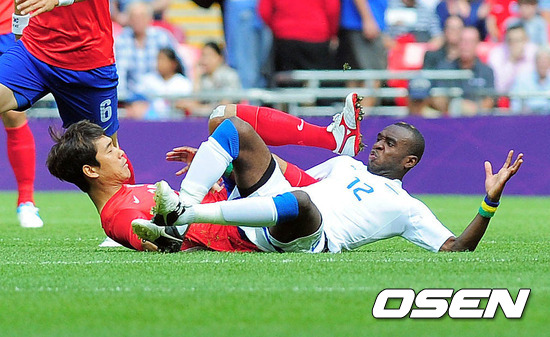 [OSEN=런던(영국), 올림픽공동취재단] 2일(한국시간) 새벽 영국 런던 웸블리 스타디움에서 벌어진 2012런던올림픽 남자축구 조별리그 B조 최종전 가봉과의 경기, 전반 대한민국 박주영과 가봉 탄지고라가 충돌하고 있다.