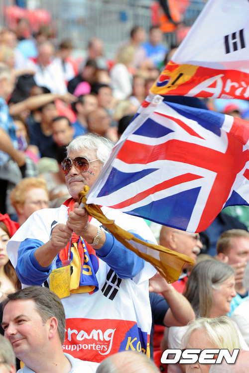 [OSEN=런던(영국), 올림픽공동취재단] 2일(한국시간) 새벽 영국 런던 웸블리 스타디움에서 벌어진 2012런던올림픽 남자축구 조별리그 B조 최종전 가봉과의 경기, 한 관객이 태극기 티셔츠를 입고 응원을 펼치고 있다.