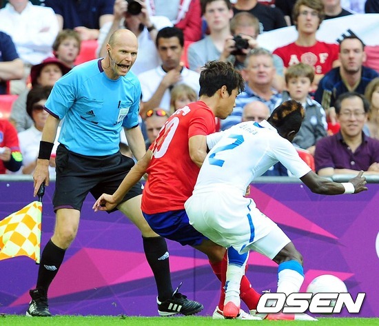 [OSEN=런던(영국), 올림픽공동취재단] 2일(한국시간) 새벽 영국 런던 웸블리 스타디움에서 벌어진 2012런던올림픽 남자축구 조별리그 B조 최종전 가봉과의 경기 전반 박주영의 볼 터치때 선심이 재미있는 표정을 짓고 있다.