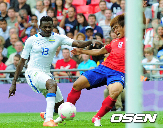 [OSEN=런던(영국), 올림픽공동취재단] 2일(한국시간) 새벽 영국 런던 웸블리 스타디움에서 벌어진 2012런던올림픽 남자축구 조별리그 B조 최종전 가봉과의 경기, 전반 대한민국 백성동이 슛동작 중 가봉 부수구의 발에 걸려 넘어지고 있다.