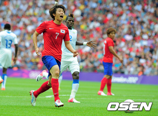 [OSEN=런던(영국), 올림픽공동취재단] 2일(한국시간) 새벽 영국 런던 웸블리 스타디움에서 벌어진 2012런던올림픽 남자축구 조별리그 B조 최종전 가봉과의 경기, 전반 대한민국 김보경이 주심의 휘슬에 아쉬워하고 있다.