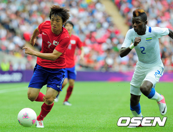 [OSEN=런던(영국), 올림픽공동취재단] 2일(한국시간) 새벽 영국 런던 웸블리 스타디움에서 벌어진 2012런던올림픽 남자축구 조별리그 B조 최종전 가봉과의 경기, 전반 대한민국 김보경이 가봉 딘다를 돌파하고 있다.