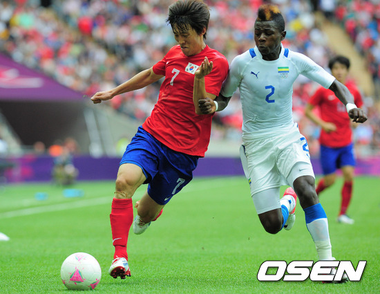 [OSEN=런던(영국), 올림픽공동취재단] 2일(한국시간) 새벽 영국 런던 웸블리 스타디움에서 벌어진 2012런던올림픽 남자축구 조별리그 B조 최종전 가봉과의 경기, 전반 대한민국 김보경이 가봉 딘다를 돌파하고 있다.