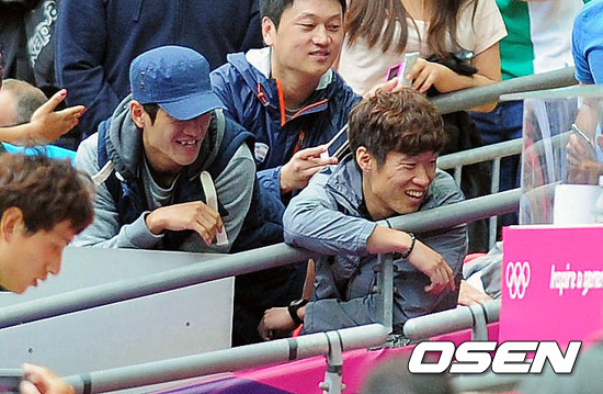 [OSEN=런던(영국), 올림픽공동취재단] 2일(한국시간) 새벽 영국 런던 웸블리 스타디움에서 벌어진 2012런던올림픽 남자축구 조별리그 B조 최종전 가봉과의 경기, 경기장을 방문한 이청용과 박지성이 경기를 바라보고 있다.