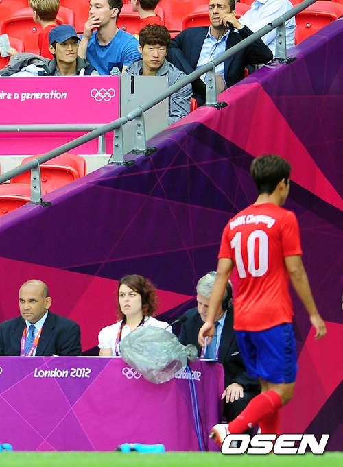 [OSEN=런던(영국), 올림픽공동취재단] 2일(한국시간) 새벽 영국 런던 웸블리 스타디움에서 벌어진 2012런던올림픽 남자축구 조별리그 B조 최종전 가봉과의 경기 후반 교체되어 나가는 박주영을 박지성이 바라보고 있다.