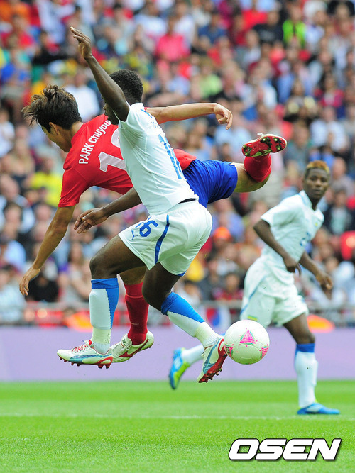[OSEN=런던(영국), 올림픽공동취재단] 2일(한국시간) 새벽 영국 런던 웸블리 스타디움에서 벌어진 2012런던올림픽 남자축구 조별리그 B조 최종전 가봉과의 경기, 후반 대한민국 박주영이 가봉 은동과 공중볼 다툼을 하고 있다.