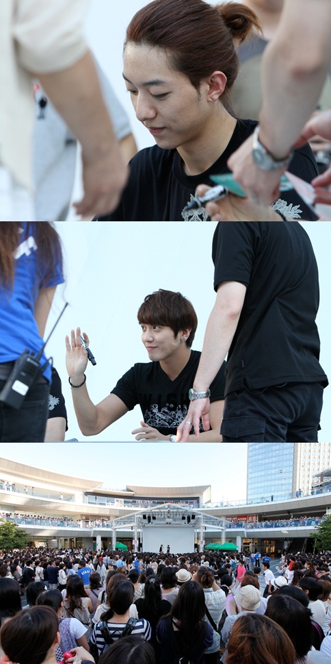 정용화와 이정신은 이날 "더운 날씨에도 이곳까지 저희들을 직접 보러 와주셔서 정말 감사 드린다"는 인사말로 팬들을 반갑게 맞이했으며, "오늘 3번째 일본 싱글 '컴 온'이 발매되는데, 많이 들어 달라"고 당부했다.