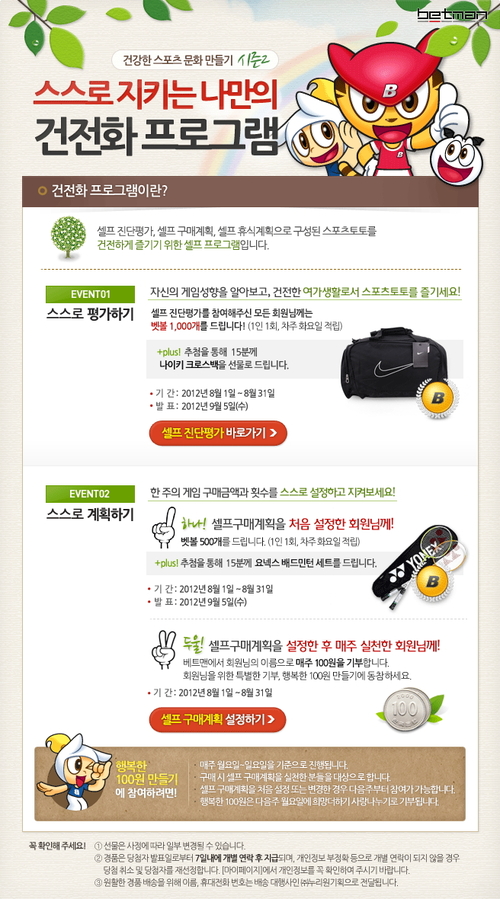 이번 캠페인 기간 동안 셀프진단평가에 참여한 모든 회원들에게는 벳볼 1000개를 적립해주고 추첨을 통해 나이키 크로스백(15명)을 나눠준다. 또 셀프구매계획을 처음 설정한 회원들에게는 벳볼 500개를 제공하고, 추첨을 통해 요넥스 배드민턴 세트(15명)를 증정한다.