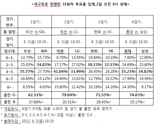 [야구토토] 국민체육진흥공단(www.kspo.or.kr)이 발행하는 체육진흥투표권 수탁사업자인 스포츠토토 공식 온라인 발매 사이트인 베트맨(www.betman.co.kr)이 내달 3일 오후 6시 30분에 열리는 2012 프로야구 4경기 8개팀을 대상으로 한 야구토토 런앤런 31회차 투표율을 중간집계 결과, 참가자들의 대다수인 74.83%는 롯데-삼성(4경기)전에서 홈런이 나올 가능성을 가장 높게 내다봤다고 밝혔다.