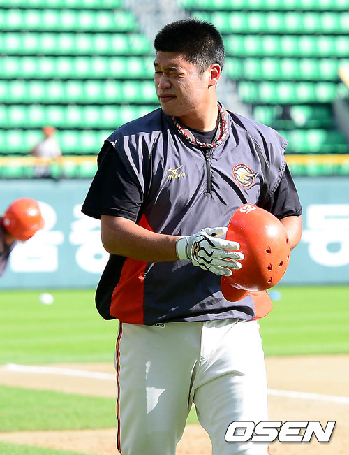 2일 오후 서울 잠실구장에서 열리는 '2012 팔도 프로야구' LG 트윈스와 한화 이글스의 경기 시작전 최진행이 훈련 중 인상을 찌푸리고 있다.