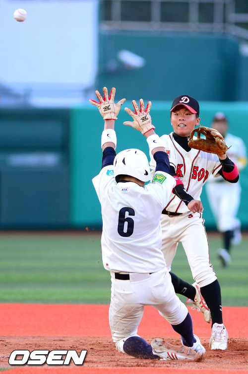 2일 오후 서울 목동구장에서 열린 '제67회 청룡기 전국 고교야구선수권대회 겸 주말리그 후반기 왕중왕전' 덕수고와 신일고의 결승전 경기, 2회말 1사 1루 신일고 김나눔의 타구를 덕수고 김하민이 잡아 1루 주자 계정웅을 포스 아웃 시키고 1루로 송구하고 있다.