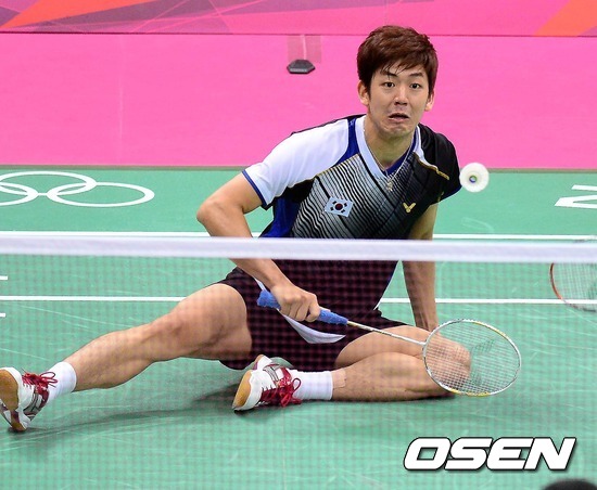 이용대가 넘어져서도 셔틀콕을 받아 넘기고 있다. /jpnews@osen.co.kr