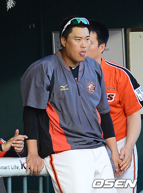 2일 오후 서울 잠실구장에서 열린 '2012 팔도 프로야구' LG 트윈스와 한화 이글스의 경기 2회말 1사 정의윤의 타석, 덕아웃에 있던 류현진이 혀를 내밀며 지친 제스처를 취하고 있다.