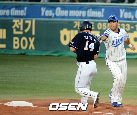 2일 대구구장에서 열린 '2012 팔도 프로야구' 삼성 라이온즈와 두산 베어스 경기 3회초 선두타자 고영민 내야땅볼때 삼성 채태인 1루수가 송구위치가 베이스에서 멀어지자 포구를 한뒤 태그아웃을 시키고 있다.