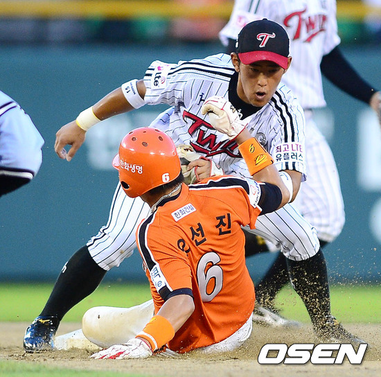 2일 오후 서울 잠실구장에서 열린 '2012 팔도 프로야구' LG 트윈스와 한화 이글스의 경기 3회초 2사 1루 이여상의 타석, 1루주자 오선진이 도루에 실패하고 있다.