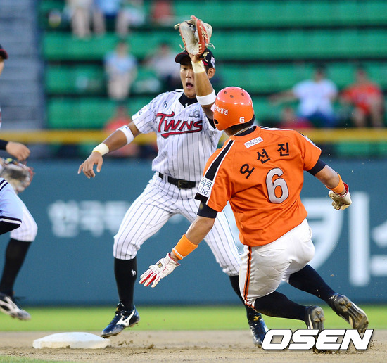 2일 오후 서울 잠실구장에서 열린 '2012 팔도 프로야구' LG 트윈스와 한화 이글스의 경기 3회초 2사 1루 이여상의 타석, 1루주자 오선진이 도루에 실패하고 있다.