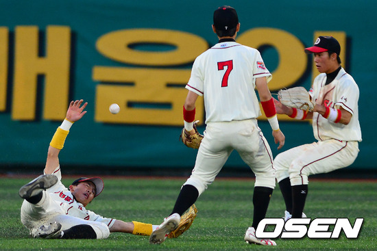 2일 오후 서울 목동구장에서 열린 '제67회 청룡기 전국 고교야구선수권대회 겸 주말리그 후반기 왕중왕전' 덕수고와 신일고의 결승전 경기, 4회말 1사 1루 신일고 김영환의 타구를 덕수고 김경형이 슬라이딩으로 잡으려다 공을 놓치고 있다.